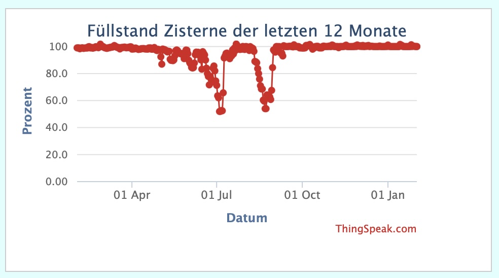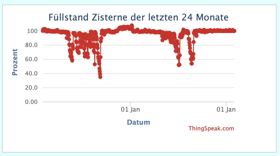 Der hier gezeigte Graph (Nutzung der Clouddaten) zeigt den Füllstand meiner 6000 Liter Zisterne der letzten 180 Tage an. (die Aufzeichnung hat bereits am 07.01.2021 begonnen) Wenn man die Datenpunkte mit der Maus berührt, kann man das Datum und den genauen Datenwert ablesen. Hier zwei Ansichten des Füllstandes im Zeitraum 12 und 24 Monate.