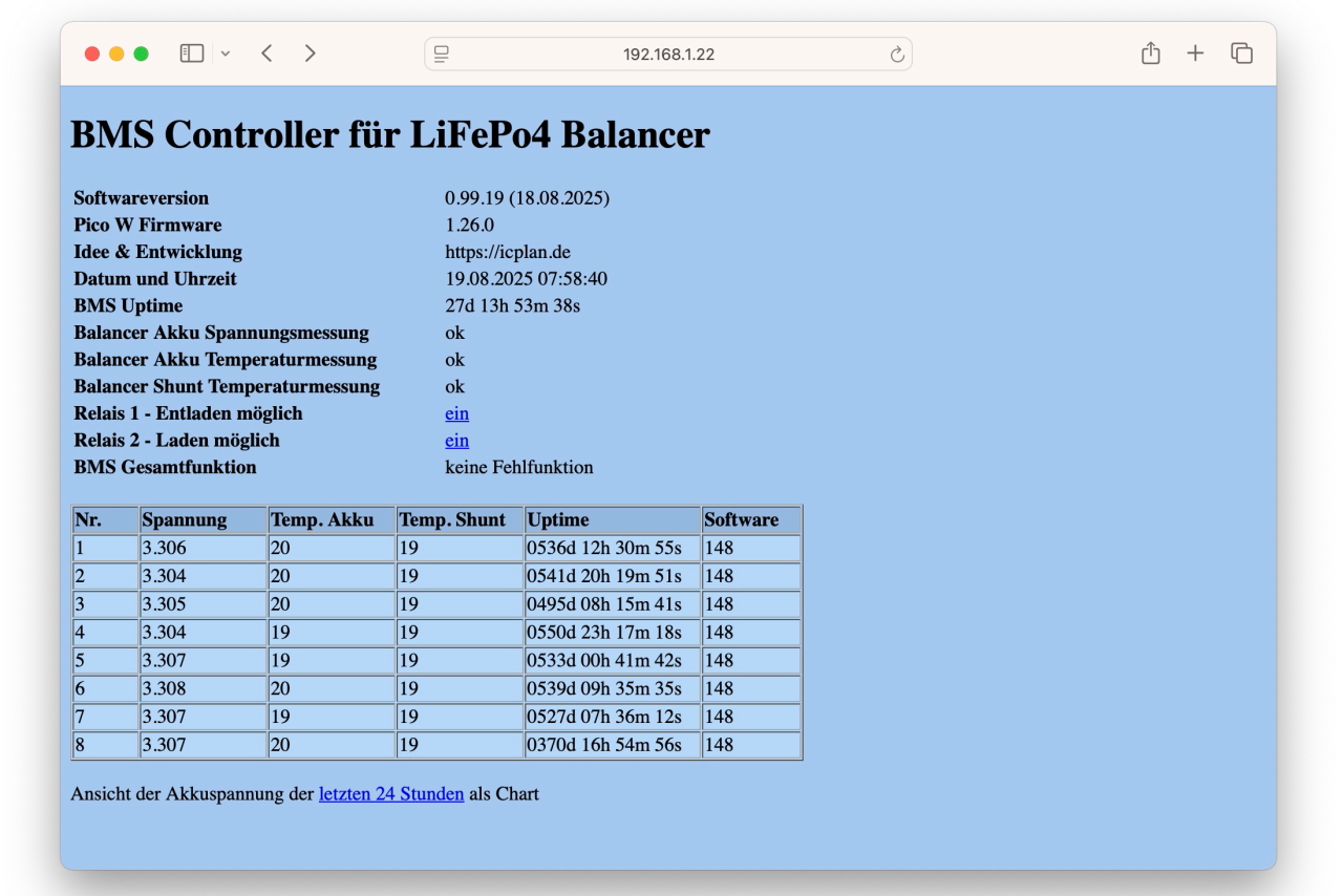 Die BMS Software im Raspberry Pico W ( Github ) wurde weiter optimiert und auch gleich mit der neuen Raspberry Pico W Firmware V1.26.0 getestet. Sie arbeitet absolut zuverlässig und so war es erforderlich, dass die im OLED Display gezeigte Uptime um eine hunderter Stelle der UP-Tage erweitert werden musste.